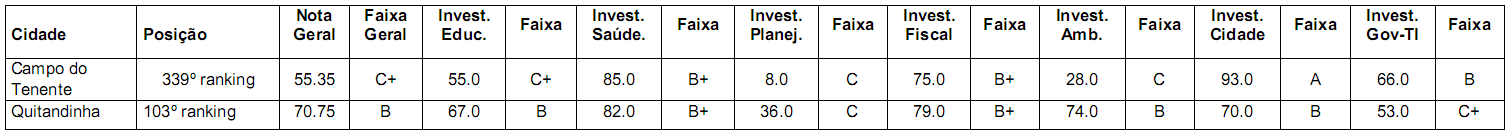 A redação do jornal Gazeta de Quitandinha & Campo do Tenente, pesquisou a situação dos nossos dois municípios, Campo do Tenente e Quitandinha (ver tabela abaixo). E dentre todos os aspectos das diversas áreas, dá para se ter um raio-X, de quantas anda a efetividade de ambas as administrações públicas. Campo do Tenente ficou com nota geral 55,35 e se destacou mais nos investimentos na saúde, cidade e governo TI. Enquanto Quitandinha foi superior nos investimentos nas áreas de educação, planejamento, fiscal, e ambiente. Campo do Tenente atingiu o conceito C+, enquanto Quitandinha atingiu o conceito B.