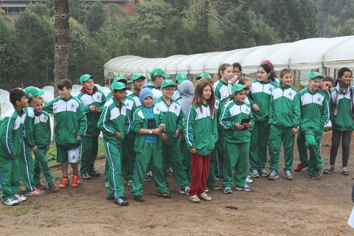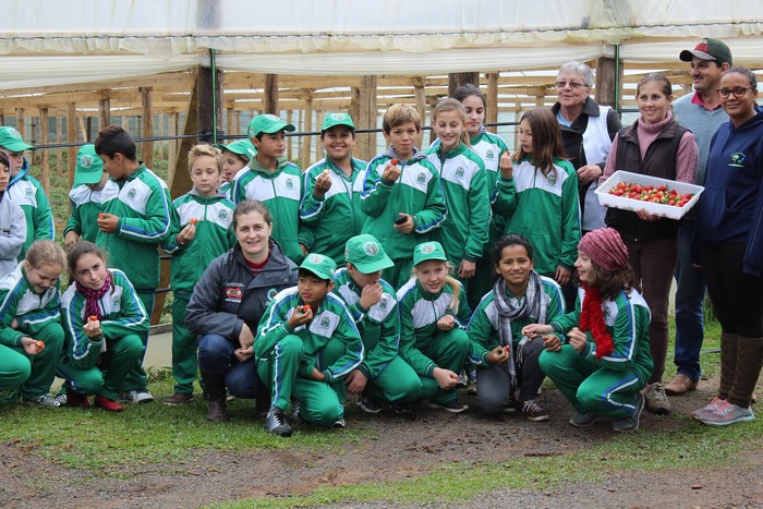 A segunda propriedade a ser visitada foi à plantação de morangos orgânicos em cultivo protegido. Nesta propriedade fomos recebidos pelo casal Altierries e Joanira, os quais vivem da renda vinda da produção de 32.000 mudas cultivadas de morango. A eng. Agrônoma Francieli M. C. Schuhli explanou sobre o sistema de produção, irrigação, tratos culturais, colheita e cuidados essenciais para obter um produto de qualidade. No final da visita os alunos puderam saborear os frutos e observaram características organolépticas que fazem dos morangos Belo Horizonte o maior sucesso.