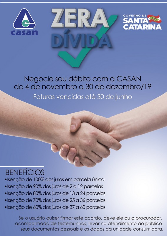 A CASAN mantém até o próximo dia 30 de dezembro a 5ª edição de seu Programa de Recuperação de Créditos, o ZERA DÍVIDA. O objetivo é estimular a regularização de débitos de clientes ativos e inativos.