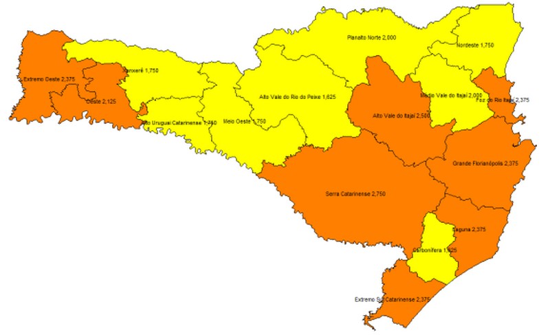 Duas regiões estão em alerta depois no aumento no número de óbitos oriundos do novo coronavÃrus: Extremo Oeste e Serra Catarinense ultrapassaram a relação de mortalidade 2/100.000 habitantes e, nesse aspecto, aponta alerta para a expansão do vÃrus.