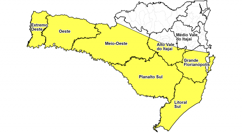 A ocorrência deve ter início perto das 21h desta segunda no Oeste, Meio-Oeste e Planalto Sul. A partir da manhã de terça-feira (7), a chuva atinge as demais áreas destacadas em amarelo no mapa abaixo:
