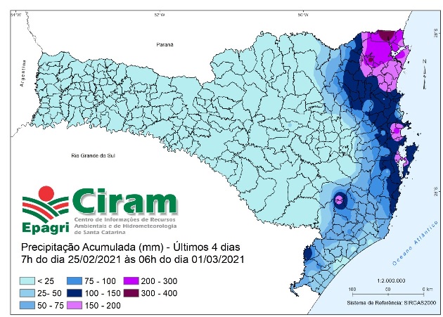 O mês de fevereiro terminou chuvoso, principalmente no litoral de Santa Catarina, e março não começou muito diferente. A previsão é de chuvas dentro do volume esperado para essa época do ano. Os próximos dias terão pancadas de chuva em todas as regiões do estado, com nebulosidade variável. As informações são da Epagri/Ciram.