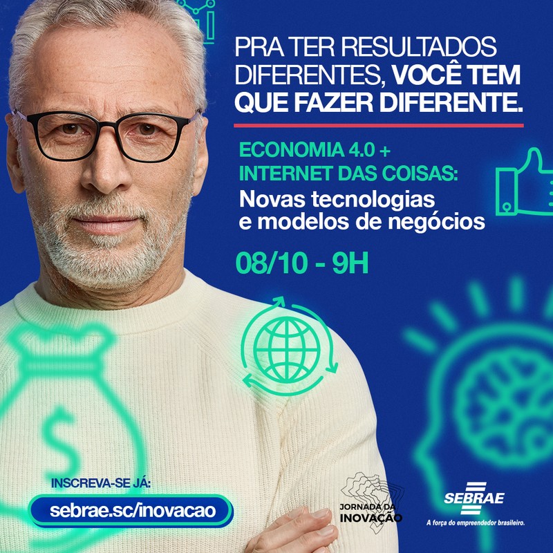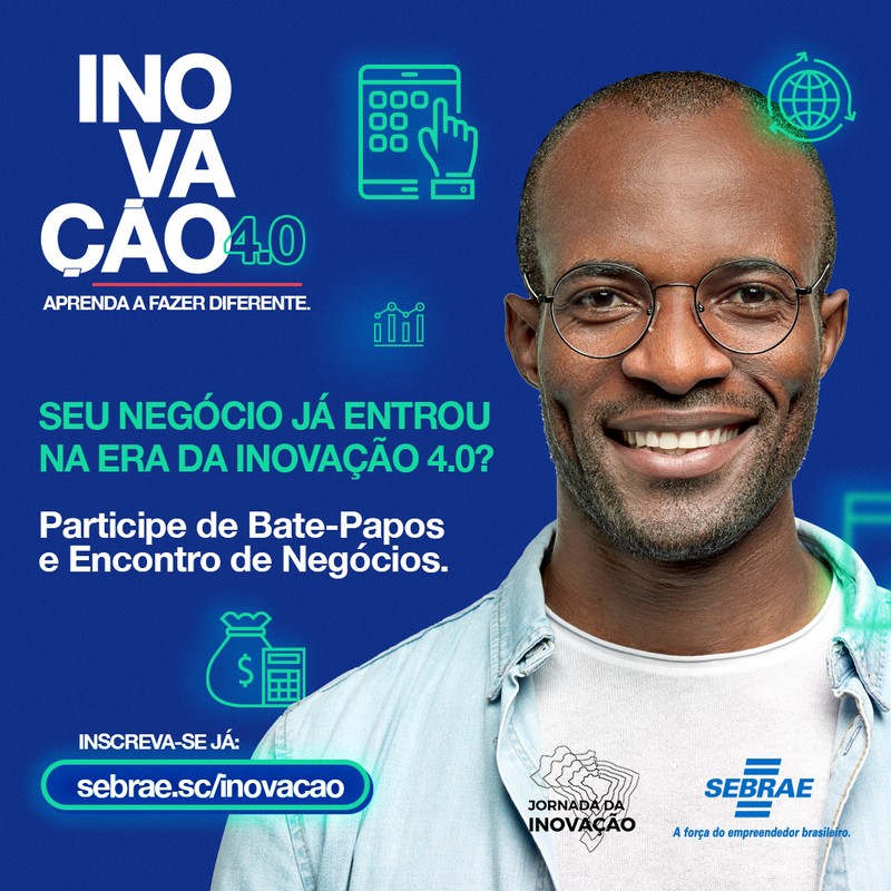 Com o intuito de ajudar os negócios a se adequarem à nova realidade, o evento “Jornada Inovação 4.0: aprenda a fazer diferente”, irá apresentar uma série de dicas e métodos para inovação. A iniciativa é do Sebrae/SC, e o primeiro encontro será realizado online na próxima quinta-feira, 1º de outubro, às 14h. As inscrições podem ser realizadas pelo link http://sebrae.sc/inovacao.