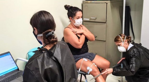 De acordo com Maria Cristine Campos, estudante de doutorado no programa de Neurociências da UFSC e uma das responsáveis pela avaliação dos pacientes, os exercícios são prescritos individualmente. “A caminhada na esteira é prescrita de maneira individual com base na frequência cardíaca e na tolerância do paciente. Depois, eles vão para o exercício de força, com fortalecimento muscular, que trabalha tronco, membros superiores e inferiores, com caneleiras e halteres. Em seguida fazem alongamento. Se for necessário, é feito exercício respiratório. Até agora não foi necessário. Mas está incluído no protocolo”.