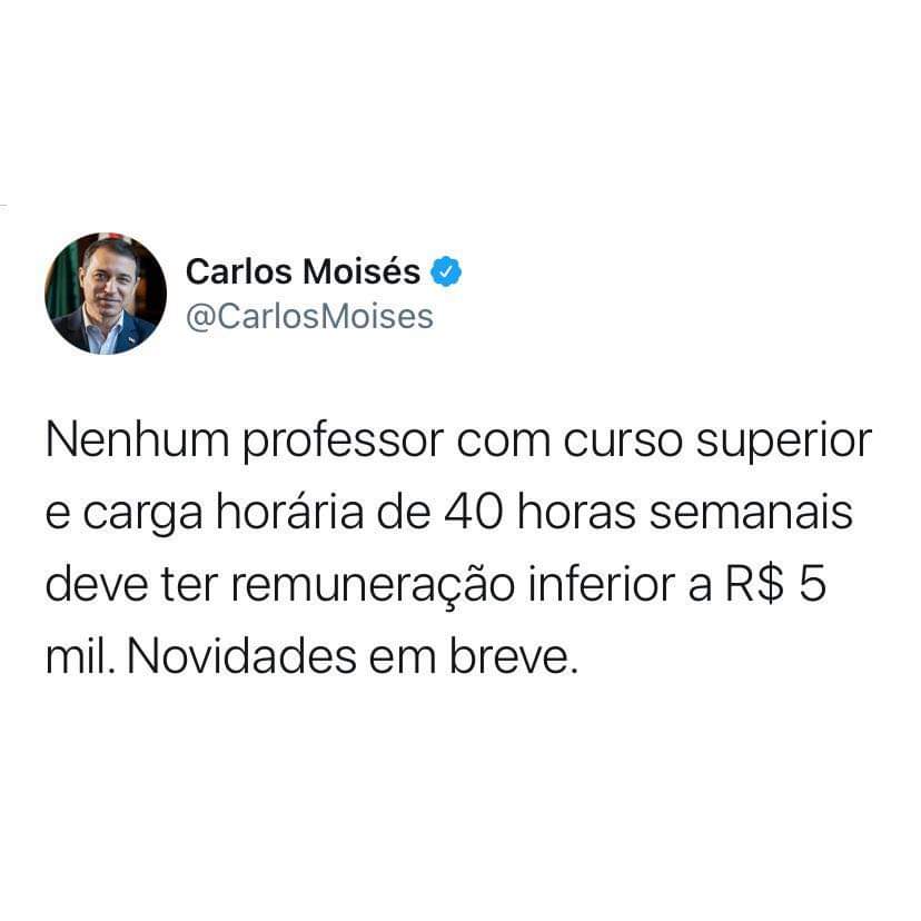 O governador de Santa Catarina, Carlos Moisés (PSL), anunciou nesta segunda-feira (14) através das redes sociais que nenhum professor da rede estadual que cumpra 40 horas vai receber menos de R$ 5 mil em Santa Catarina.