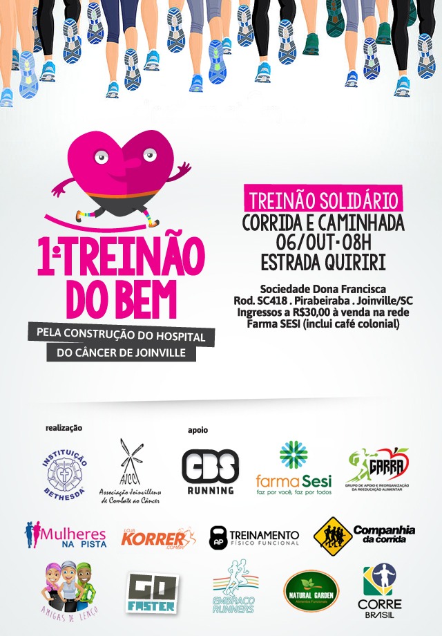 Começaram a ser vendidos nesta quarta-feira (8 de agosto), na rede farmaSesi de Joinville, os ingressos para o 1º Treinão do Bem, um treino de corrida que visa a arrecadação de recursos para a construção do Hospital do Câncer de Joinville. O evento é uma realização da Instituição Bethesda e da Associação Joinvilense de Combate ao Câncer (AJCC), em parceria com as assessorias de corrida da cidade.