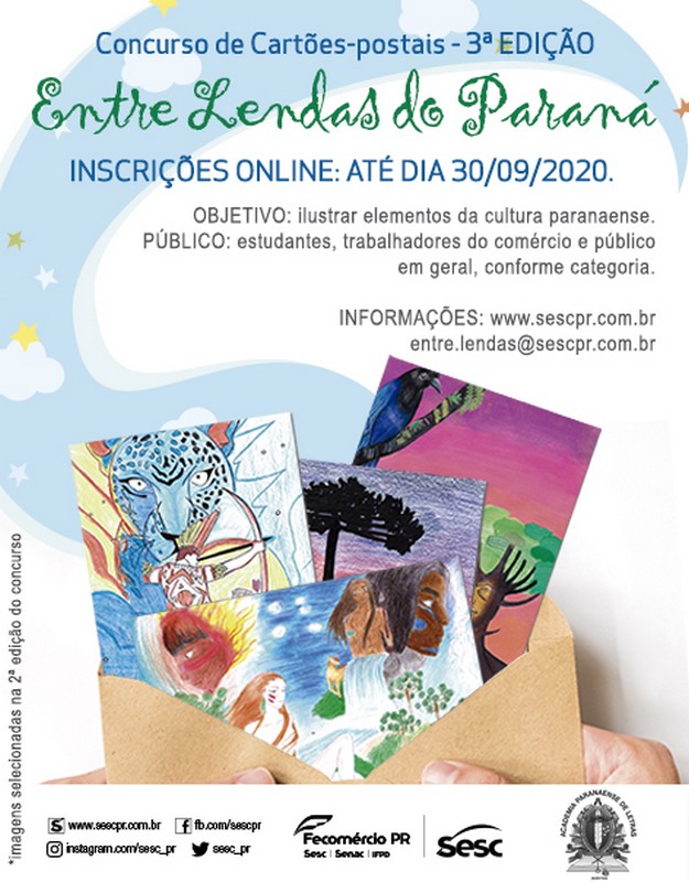 Para que a cultura do Paraná não fique apenas na tradição oral, o Sesc PR está com as inscrições abertas para a 3ª edição do Concurso Entre Lendas – uma seleção de ilustrações para compor uma coletânea de cartões postais inéditos – promovido pelo Sesc PR em parceria com a Academia Paranaense de Letras.