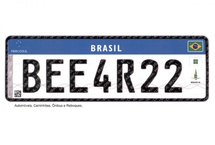 Revestidas com pelÃcula retrorrefletiva, as novas placas terão fundo branco com margem superior azul e as imagens da bandeira brasileira e o sÃmbolo do Mercosul, mantendo os atuais sete caracteres alfanuméricos. Na parte frontal, a pelÃcula protetora deverá conter as palavras Mercorsur Brasil Mercosul estampadas. Além disso, deverão possuir código de barras bidimensionais dinâmicos (Quick Response Code – QRCode) contendo números de série e acesso à s informações do banco de dados de seu fabricante.
