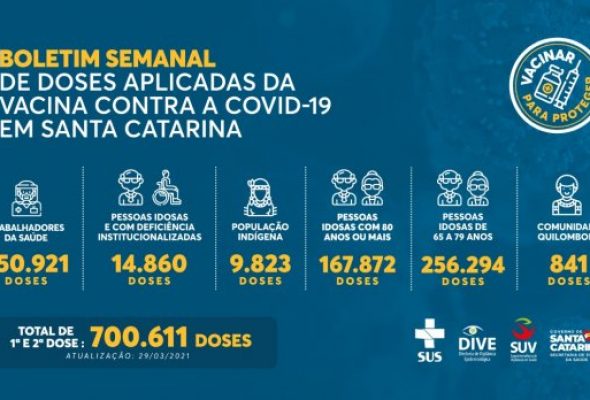 Vacinação: 700,6 mil doses da vacina contra a Covid-19 foram aplicadas em SC