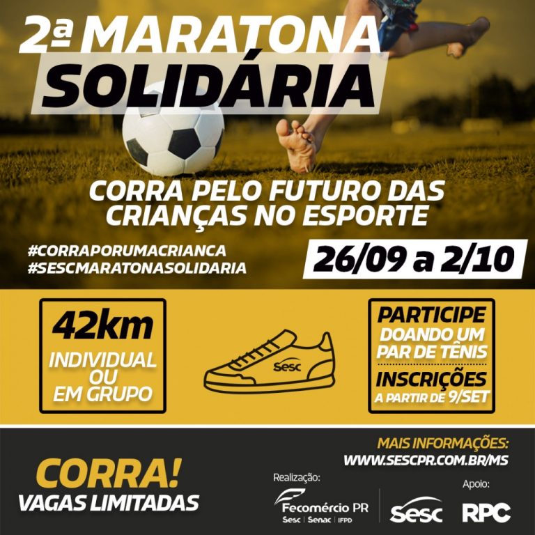 Participe da 2ª edição da Maratona Solidária do Sesc PR. Este ano, em vez da cobrança em dinheiro, as inscrições serão feitas através da doação de pares de tênis, que serão destinados às crianças atendidas no Aprender e Jogar – projeto esportivo e social do Sesc no Paraná.