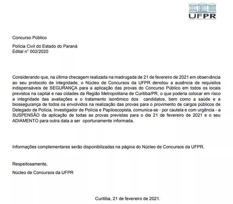 Por meio de nota, o governo estadual afirmou que abrirá processo administrativo contra o Núcleo de Concursos da Universidade Federal do Paraná (NC-UFPR) “por quebra de contrato”. Veja posicionamento completo do governo e da PolÃcia Civil abaixo.