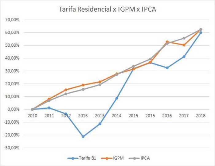 Reajuste X Inflação: No período de 2010 a 2018, o percentual da variação acumulado da tarifa residencial foi de 60,14% contra uma inflação de 62,75% para o IGP-M e 62,68% para o IPCA, indicador utilizado para a atualização dos custos operacionais da Distribuidora: