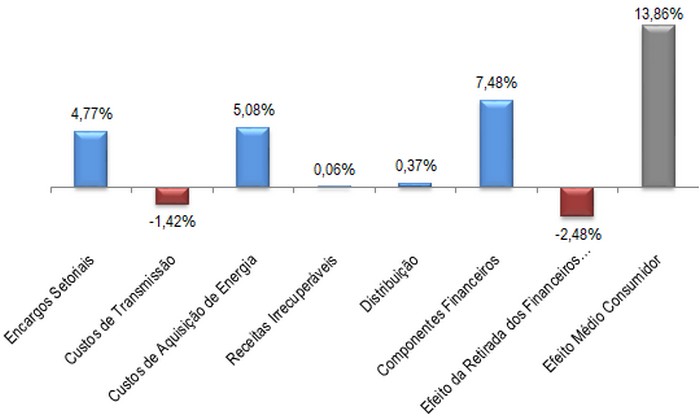 Também se destacam os componentes financeiros, em sua maior parte relacionados a despesas com compra de energia realizadas no ciclo tarifário anterior que ultrapassaram a cobertura tarifária prevista para o período, especialmente por conta do maior uso de geração térmica. Na composição do efeito médio de 13,86%, o item corresponde ao montante de 7,48%.