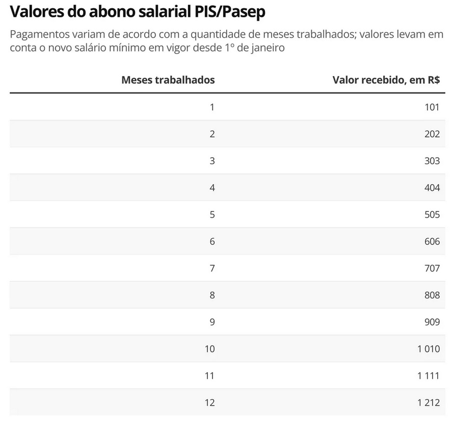 Com o aumento do salário mÃnimo em 1º de janeiro, o valor do abono salarial passa a variar de R$ 101 a R$ 1.212, de acordo com a quantidade de meses trabalhados. Só receberá o valor máximo quem trabalhou os 12 meses de 2020. Veja abaixo: