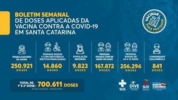 Confira aqui o Balanço Parcial atualizado da vacinação contra a Covid-19 em Santa Catarina por municÃpios (29/03/2021).