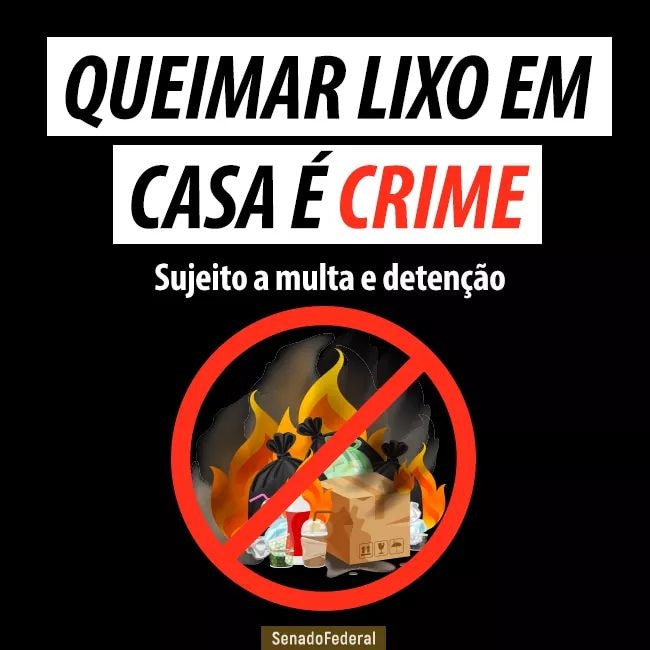 Você sabia? A queima do lixo é um ato criminoso, mesmo quando dentro de propriedade particular. Isso porque, segundo a Lei de Crimes Ambientais, são jogados na atmosfera resÃduos dos materiais queimados, causando poluição e possÃveis danos à saúde humana. A punição pode ser de multa e detenção de 6 meses a um ano. bit.ly/CrimesAmbientais-artigo-54.