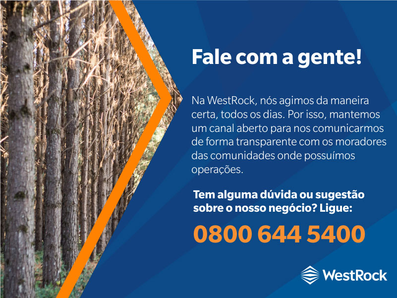 Na WestRock, nós agimos da maneira certa, todos os dias. Por isso, mantemos um canal aberto para nos comunicarmos de forma transparente com os moradores das comunidades onde possuÃmos operações. Tem alguma dúvida ou sugestão sobre o nosso negócio? Ligue: 0800 644 5400