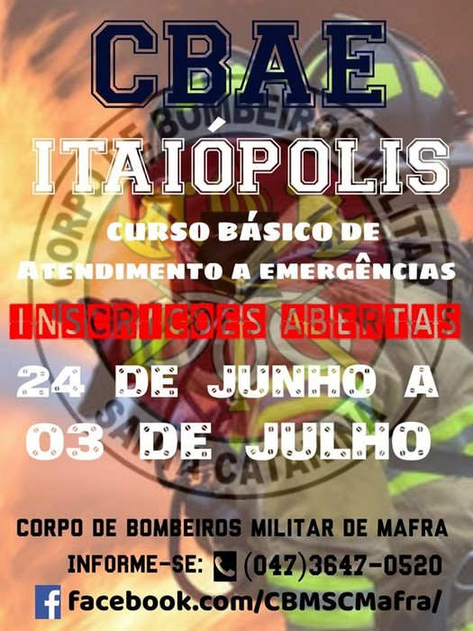 O Corpo de Bombeiros Militar está divulgando que estão abertas as inscrições para a seleção dos candidatos que pretendem fazer o Curso Básico de Atendimento a Emergência (CBAE). São 50 vagas disponíveis. O curso será realizado em Itaiópolis e as inscrições podem ser feitas a partir dessa segunda-feira, dia 24, até o dia 3 de julho.