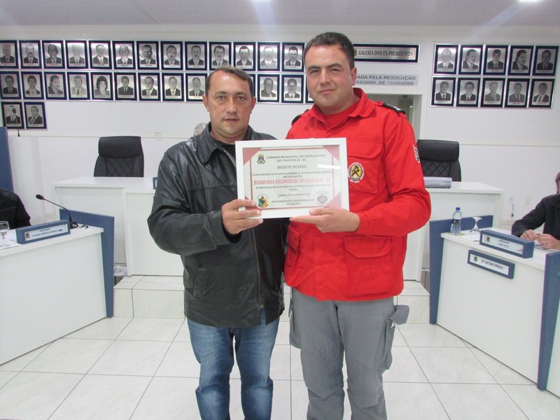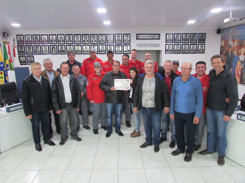 Os vereadores entregaram uma Moção de Aplausos para o Corpo de Bombeiros Voluntários. A homenagem foi prestada em comemoração ao 24º aniversário da criação da corporação no municÃpio. A entrega ocorreu na sessão ordinária da Câmara do dia 02 deste mês.