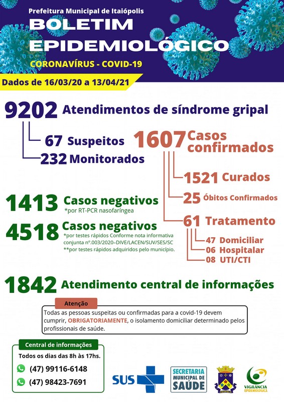 POR FAVOR, encarecidamente, só procurem o Hospital de Itaiópolis, Central Covid e Unidades de Saúde (ESF) para atendimentos de maior urgência. Em situações mais simples que possam esperar, evite ir ao setor de saúde enquanto a Pandemia estiver em estado gravíssimo. Põe a mão na consciência, cuide-se enquanto é tempo.