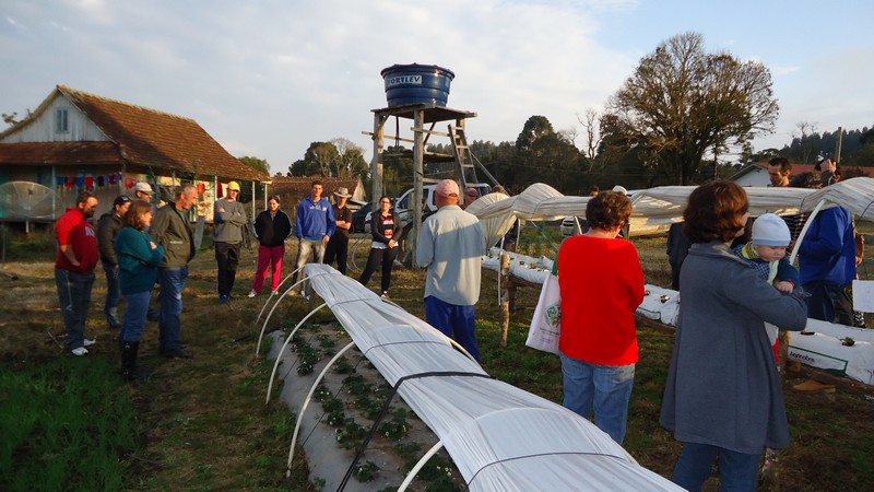 Aproveitando a experiência de mais de 5 anos do cultivo de morango pela famÃlia, foram discutidos com os presentes os sistemas de produção de morango. Os agricultores puderam ver a produção de morango convencional no solo, que a famÃlia trabalha há 5 anos, uma área teste de um ano de morango de base agroecológica no solo e a bancada elevada recém-implantada de morango semi-hidropônico com adubação agroecológica.