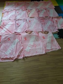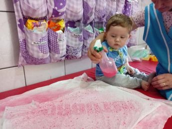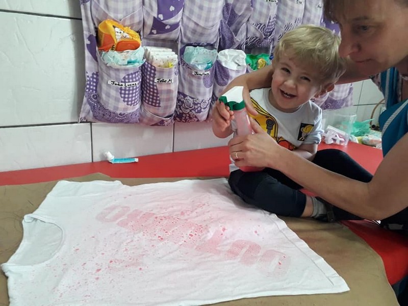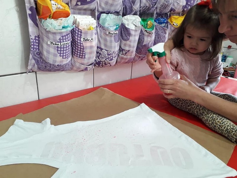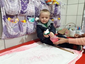 No CEI Tia Erci a da turma do Berçário, professora Andréa Z. R de Mello e suas auxiliares, realizaram várias atividades em comemoração ao Outubro Rosa com as crianças. Em uma delas os alunos pintaram uma camiseta na com a cor rosa para dar de presente às suas mães.