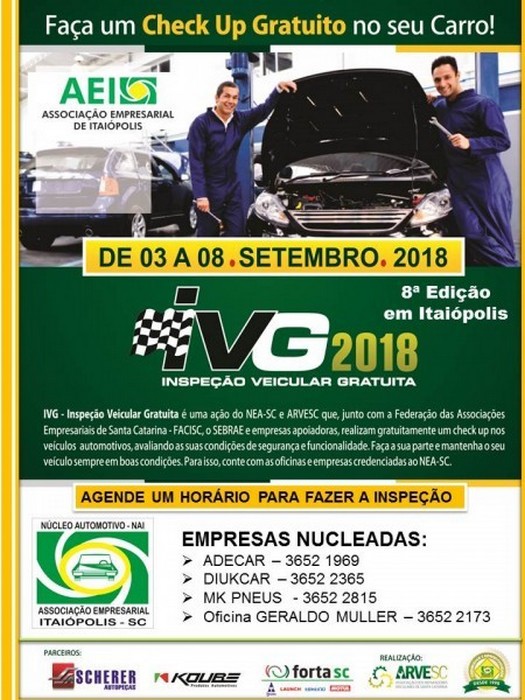 A 8° Edição da IVG – Inspeção Veicular Gratuita, organizada pelo Núcleo Automotivo da AEI vai acontecer durante os dias 03 a 08 de setembro. Esse ano, em um novo formato, dentro das oficinas nucleadas. São elas: Adecar, Diukcar, MK Pneus e Oficina Geraldo Muller.