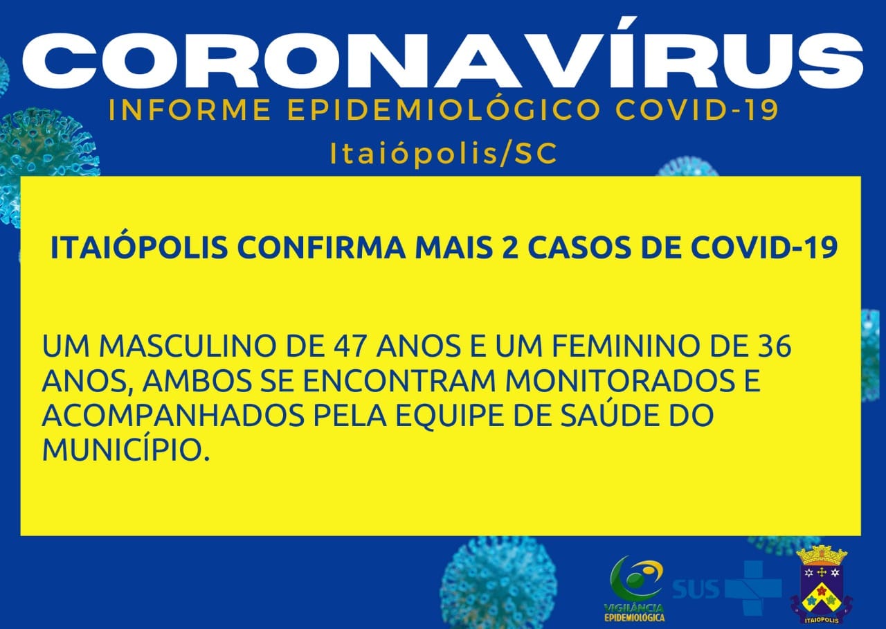 Neste sábado (11) a cidade de Itaiópolis-SC confirmou dois novos casos de Covid-19 (coronavÃrus): um homem de 47 anos de idade e uma mulher de 36 anos. Ambos estão sendo acompanhados pela equipe de saúde do municÃpio. Agora são 06 casos já confirmados, sendo que há dois óbitos e duas pessoas já estão recuperadas.