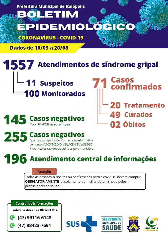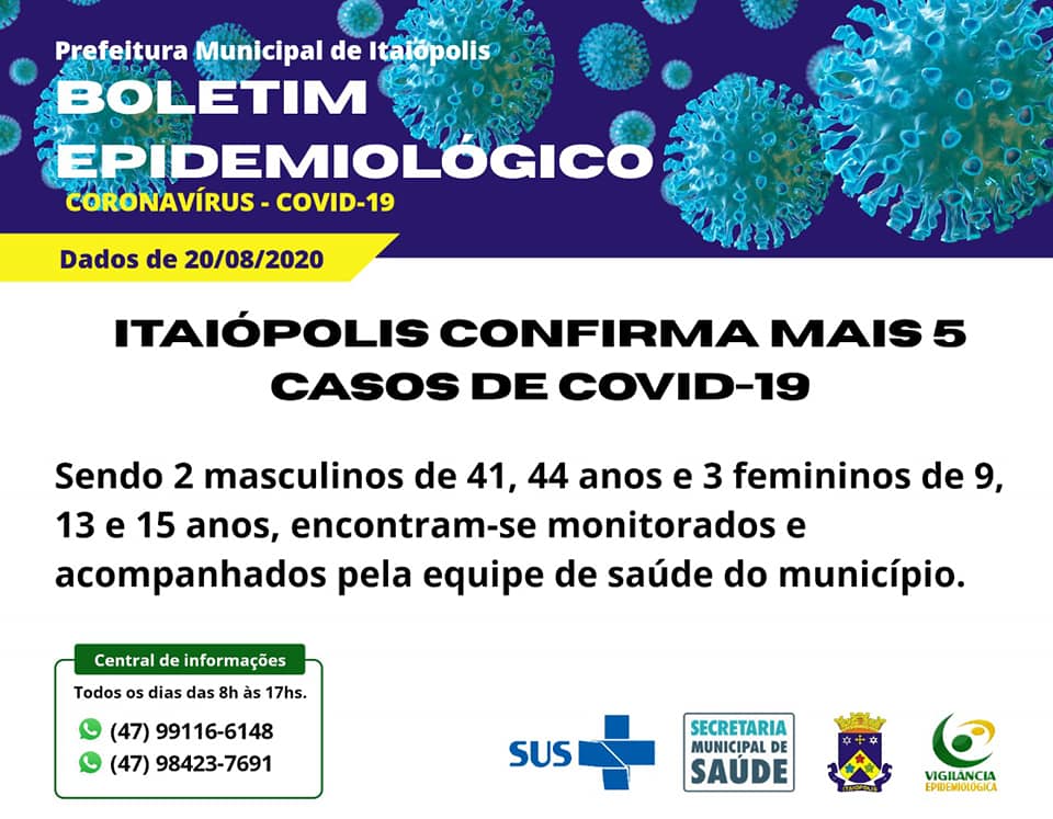 Itaiópolis confirmou mais cinco casos de Covid-19 nesta quinta-feira (20). Agora são 71 casos confirmados, sendo que 49 pessoas estão recuperadas. Confira os dados: