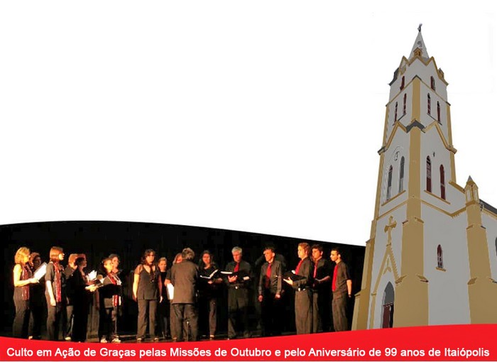 Hoje, em comemoração ao aniversário de Itaiópolis e pelas Missões de Outubro as paróquias Santo Estanislau e Nossa Senhora da Medalha Milagrosa, estarão realizando nas suas respectivas Igrejas missa de Ação de Graças. Após os cultos, em cada uma das igrejas, haverá uma apresentação do conceituado coral gaúcho Procergs, sob a regência de Manuel Figueiredo de Abreu e preparação vocal de Cintia de Los Santos.