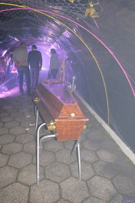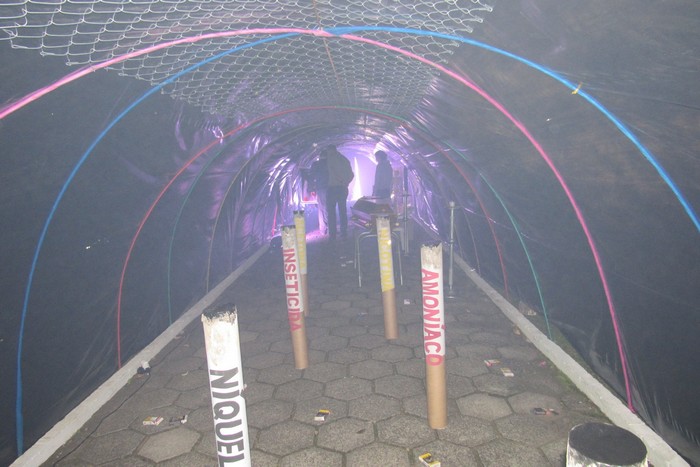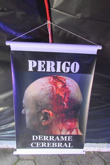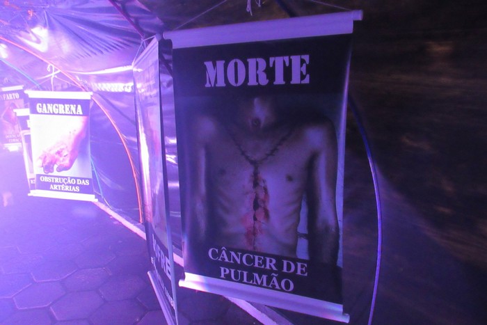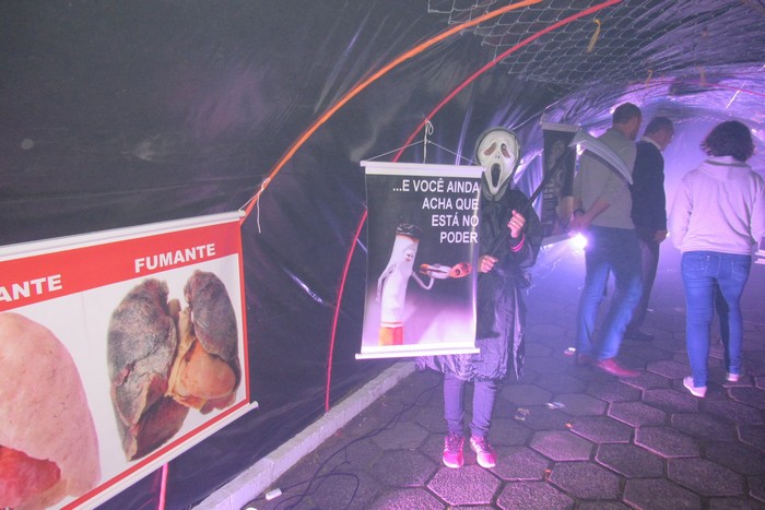 Para demonstrar os males que o cigarro traz à saúde a equipe do NASF construiu um túnel na Praça. No túnel os profissionais da saúde mostravam e explicavam o que o uso do cigarro pode causar.