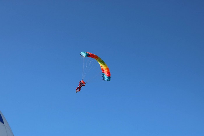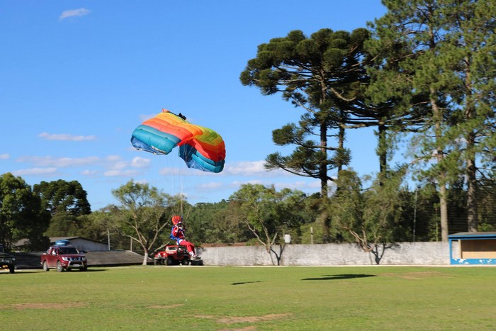 Desta vez, um balão sobrevoou o Estádio 16 de Abril e dele o papai Noel saltou utilizando um paraquedas, condição inédita no municÃpio, proporcionando aos presentes um belo espetáculo.
