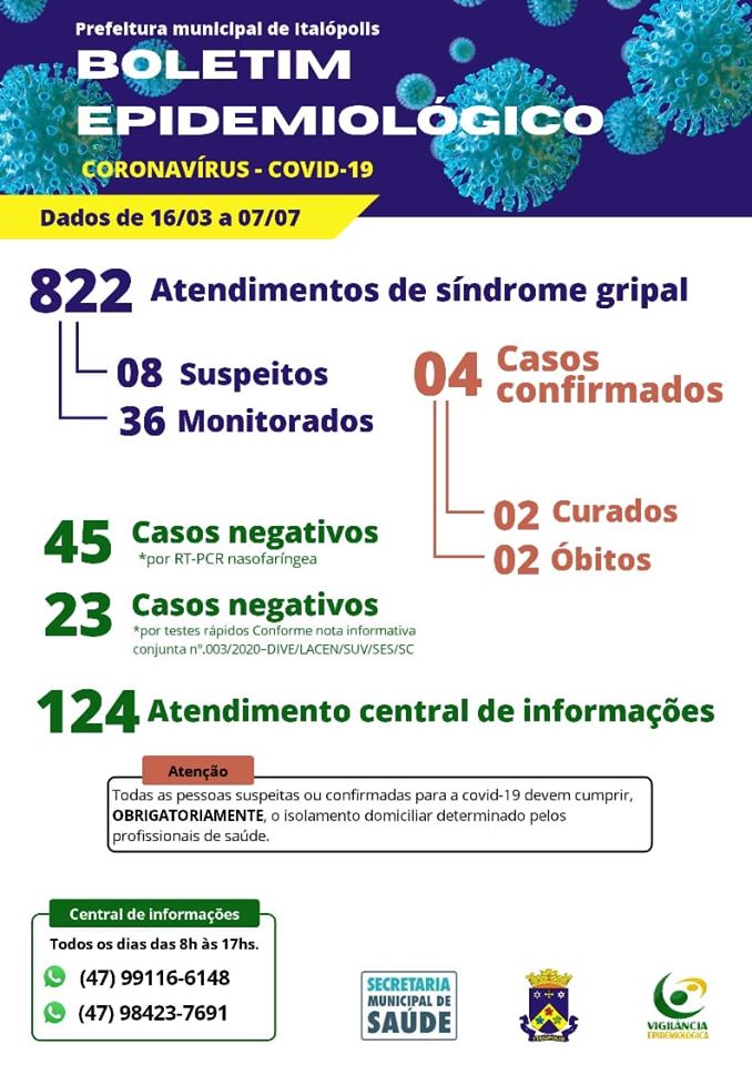Até esta terça-feira (07), Itaiópolis já registrou 04 casos positivos de Covid-19 (coronavÃrus), sendo dois óbitos e duas pessoas recuperadas.