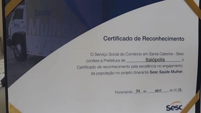 A ação gerou frutos positivos ao município de Itaiópolis, foi parabenizado e premiado com o certificado de reconhecimento pela excelência no engajamento da população no projeto itinerante Sesc Saúde da Mulher, sendo o primeiro Município de Santa Catarina a ser premiado.