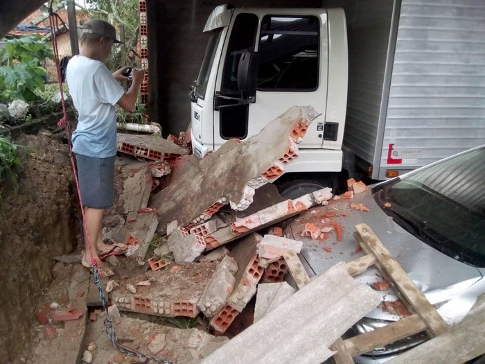 A estrutura veio a atingir um veÃculo e dois caminhões, que acabarem servindo de calço impedindo por não vir a desabar por completo a estrutura.