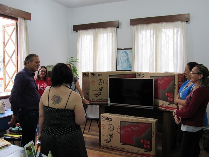 Além das TV’s, todas as unidades escolares receberam lixeira de 100 litros e de 50 litros com pedal de plástico reforçado.