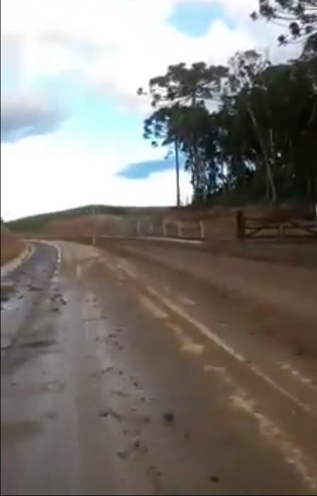 No vídeo não se consegue enxergar o asfalto, a SC-477 parece mais uma estrada de chão de tanto é o barro em cima da pavimentação.
