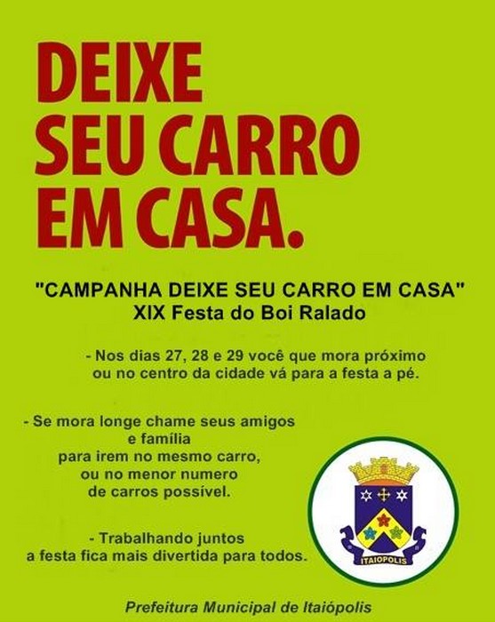No material o executivo municipal pede para população que mora próximo ao centro da cidade que deixe seus carros em casa e se dirijam a festa a pé. Para os moradores em bairros mais longes a orientação é que procurem formar grupos e que venham de carona para XIX Festa do Boi Ralado.