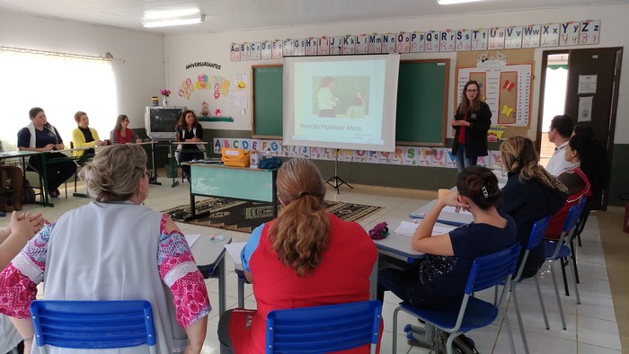 Para debater questões desafiadoras na educação, como o que se espera dos educadores ou alunos com deficiência de aprendizado e/ou de comportamento, aconteceu na tarde da última quinta-feira (17), na EMEF São Lourenço a 1ª Parada Pedagógica de 2018, reunindo os professores da unidade. Como parte da programação, a Psicóloga do setor de Atendimento Educacional Especializado – AEE, da Secretaria Municipal de Educação, Talita Pacheco Valério abordou o tema “Relação entre professor e aluno”.