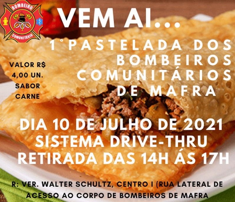 A 1ª Pastelada dos Bombeiros Comunitários de Mafra será realizada com o sistema drive-thru no dia 10 de julho.