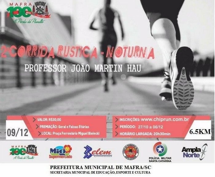 Para incentivar a prática da atividade física e favorecer o intercambio cultural esportivo, acontece neste sábado, dia 9 de dezembro, a 2ª Corrida Rústica Noturna “Professor João Martin Hau”. As inscrições pelo site encerraram na última quarta-feira, mas os interessados em participar ainda poderão se inscrever no sábado, na Praça Ferroviário Miguel Bielecki, das 10 às 19h. Nesse período também será feita entrega dos kits.