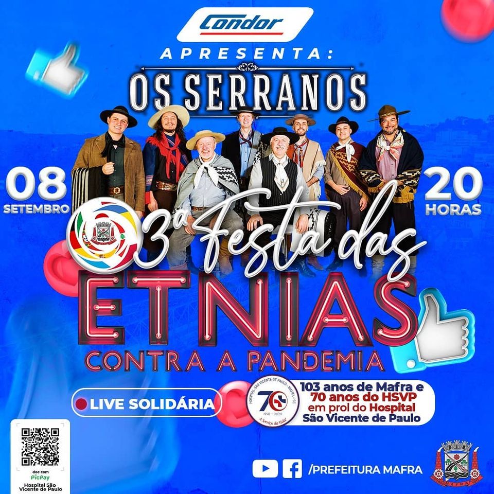 Este ano, por causa da pandemia do Covid-19, será realizada a 3ª Festa das Etnias de Mafra no formato virtual. Uma live com o grupo Os Serranos será realizada em prol do Hospital São Vicente de Paulo. Será no dia 08 de setembro às 20h.