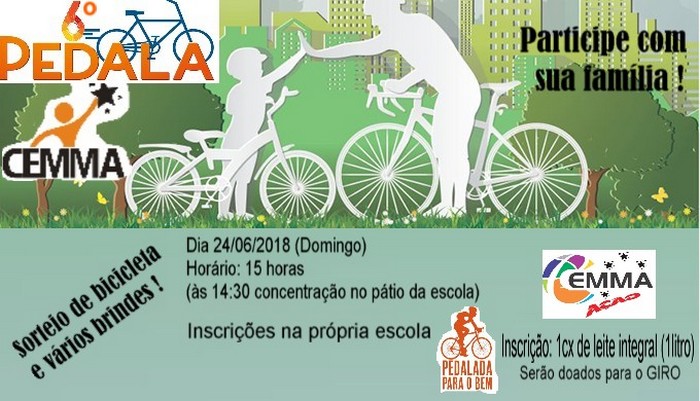 Os amantes dos esportes ao ar livre podem participar neste domingo, dia 24 de junho, do 6º Pedala CEMMA. A concentração será à s 14h30 horas no pátio da escola, com saÃda à s 15h. As inscrições são gratuitas e podem ser feitas na própria unidade. Os interessados devem levar uma caixa de leite integral, que será doada ao grupo GIRO.