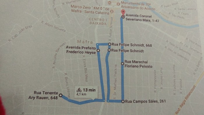 O percurso será de 4,1 km, com o trajeto saindo da escola, na tenente Ary Rauen, seguindo pela avenida Frederico Heyse até a rua AlÃpio Siqueira, seguindo pela Felipe Schmidt até a praça Lauro Muller, rua Campos Salles até a Marechal Floriano Peixoto, encerrando na praça Ferroviário Miguel Bielecki.