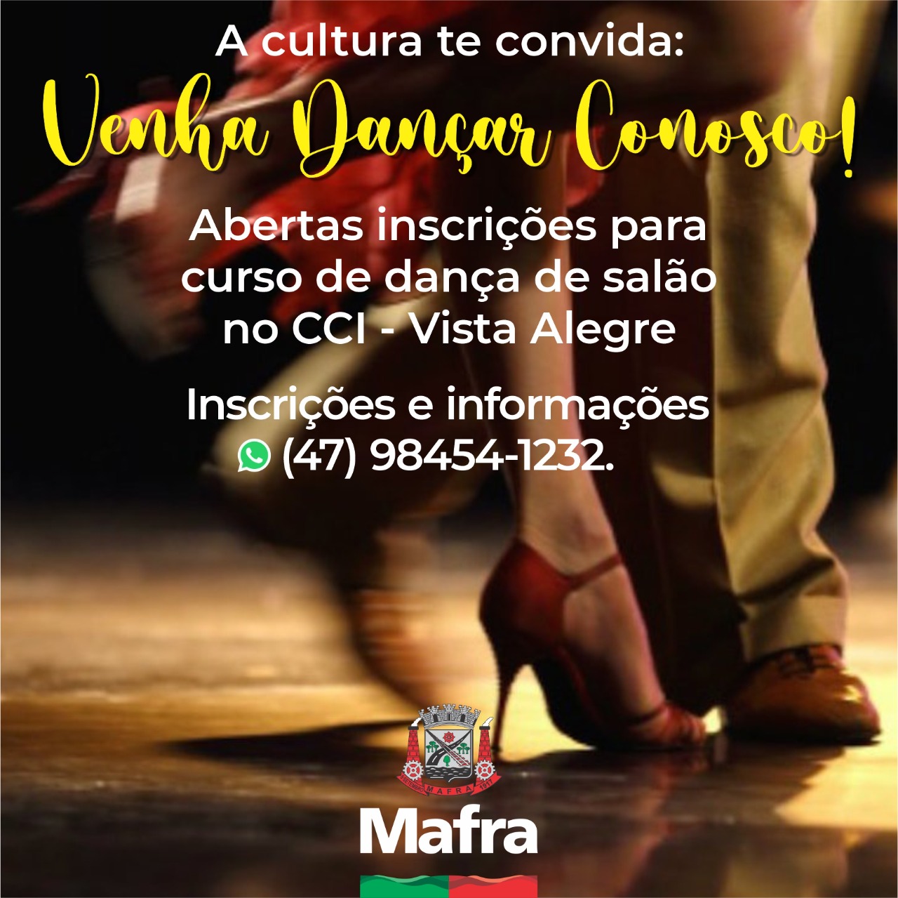 Estão abertas as inscrições para o curso de dança de salão em Mafra, uma promoção da  Associação Amigos da Cultura Mafrense com apoio da Secretaria Municipal de Educação, Esporte e Cultura. O objetivo é o resgate das danças de casais, sendo a dança de salão uma modalidade muito apreciada no município, além da preservação das tradições.