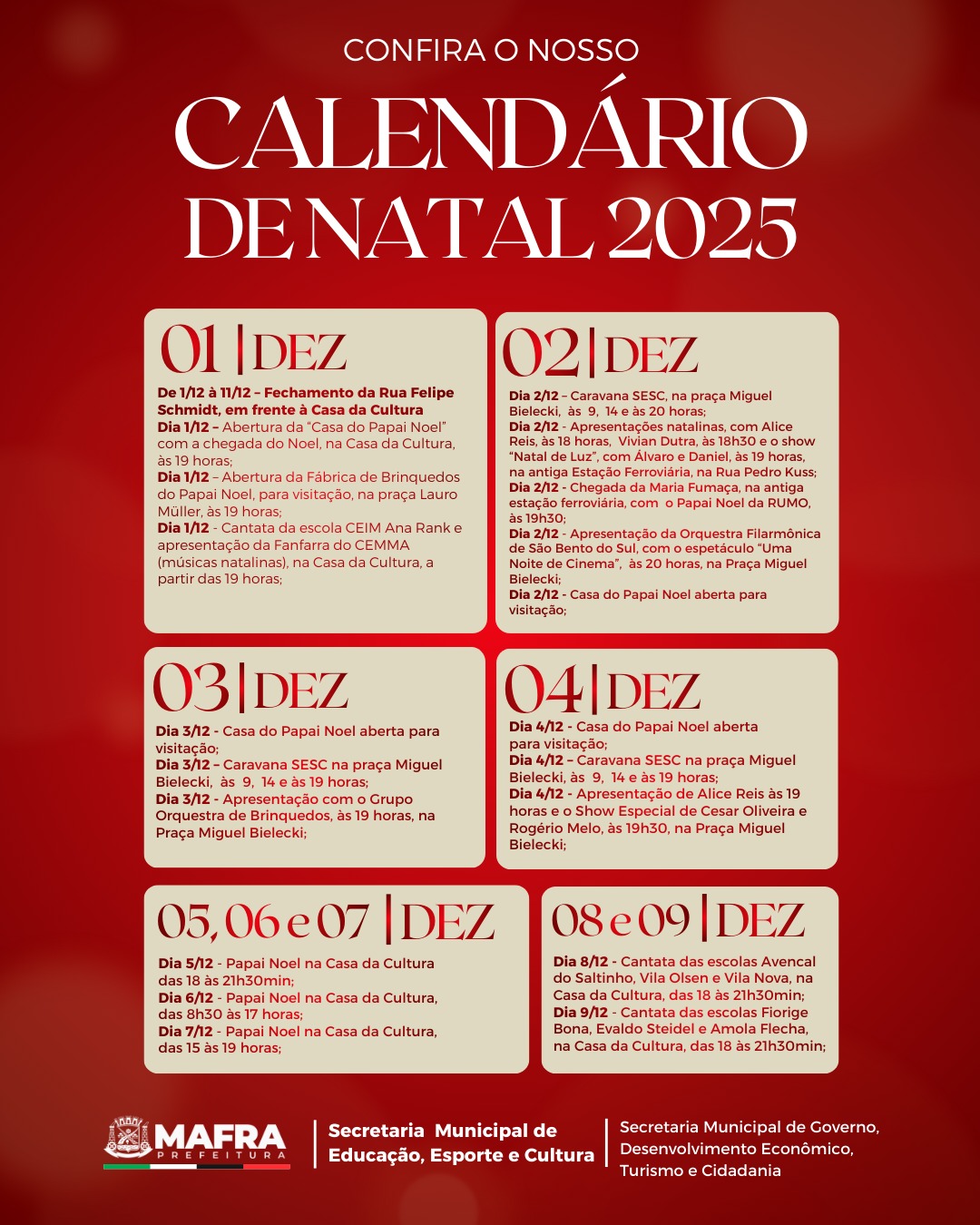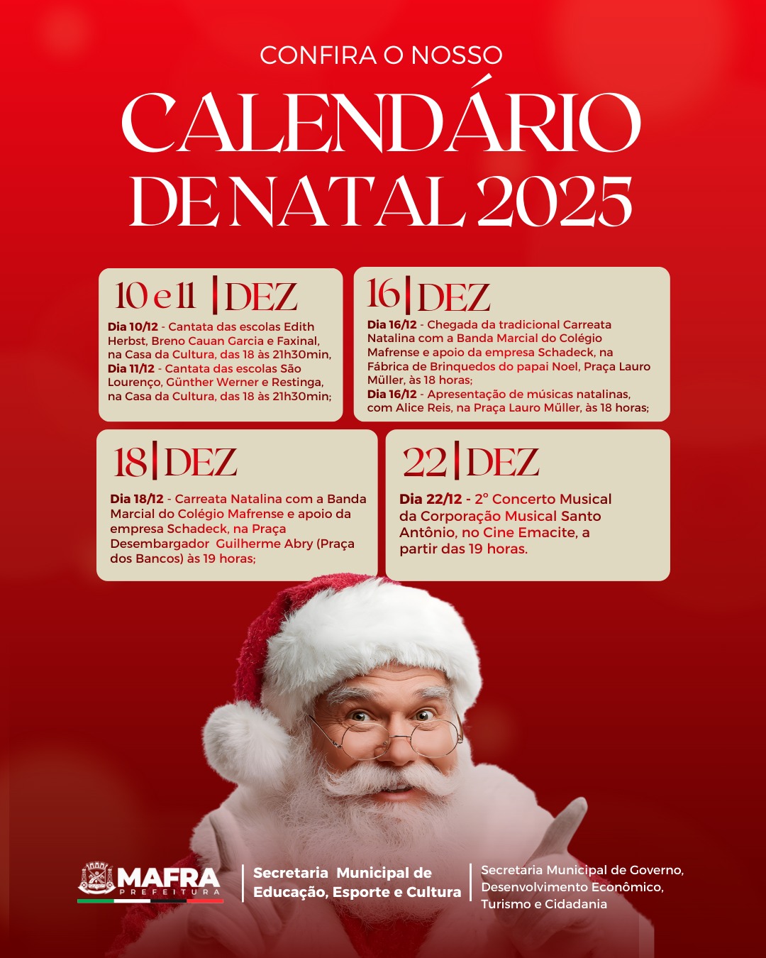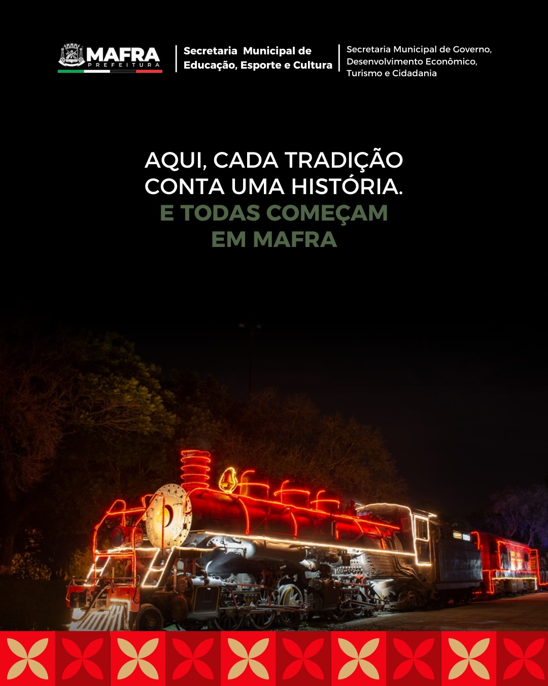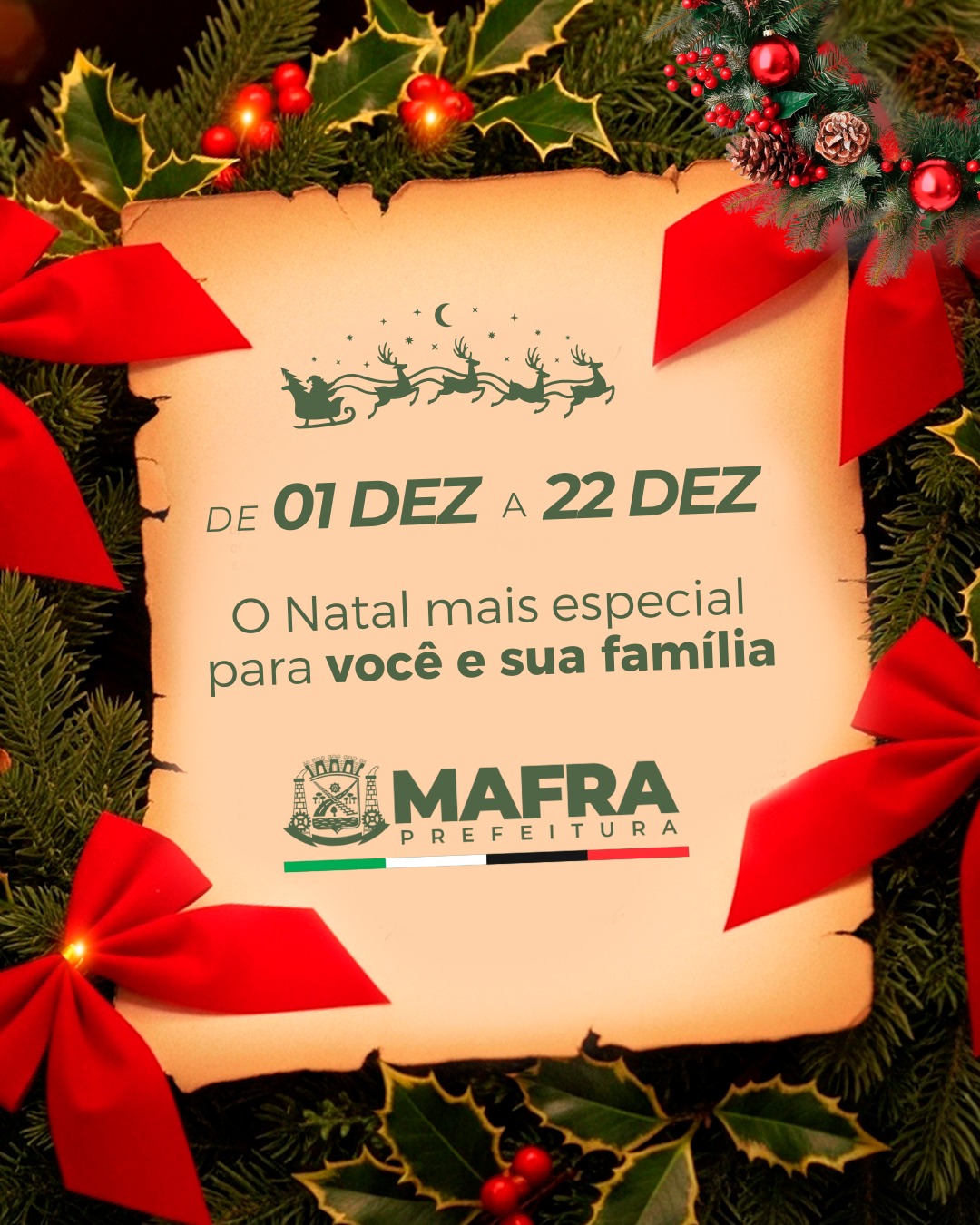 A Prefeitura de Mafra convida você e sua família para celebrar um Natal cheio de união, paz e esperança. “Vamos juntos transformar Mafra em um grande cenário de encantos”.