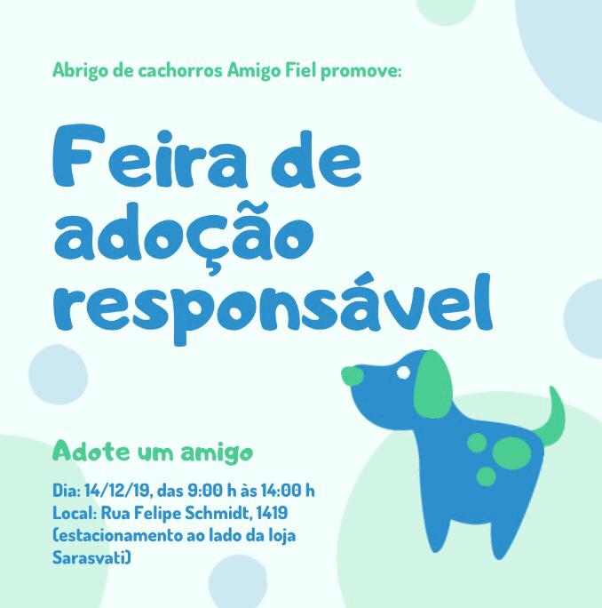 Neste sábado (14) terá feira de adoção de cachorros do Abrigo Amigo Fiel de Mafra. Será na Rua Felipe Schimdt, 1419 (estacionamento ao lado da loja Sarasvati) das 09 à s 14h. #Compartilhe com os amigos que desejam um “aumiguinho”. Adoção responsável!