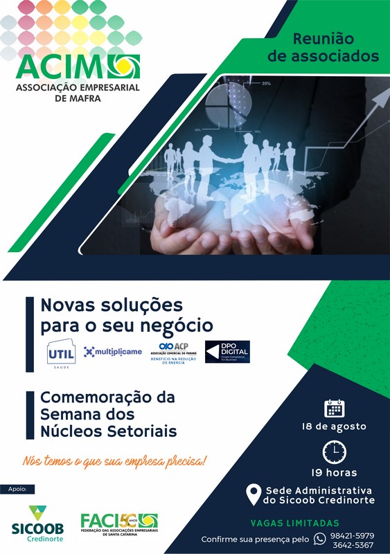 ACI de Mafra realiza a primeira reunião de associados do ano. A ação gratuita acontecerá no dia 18 de agosto, no auditório da sede administrativa do Sicoob Credinorte, às 19 horas e as vagas são limitadas, para seguir e manter todos os protocolos de segurança.