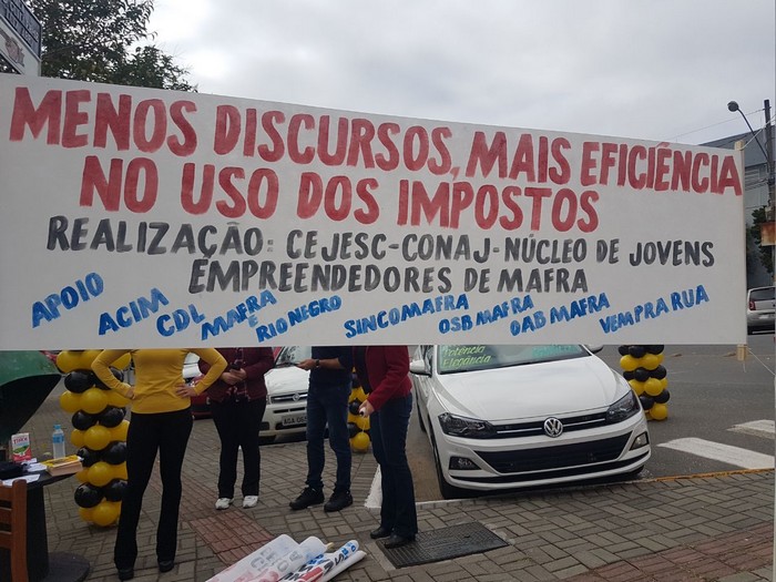 Na manhã do último sábado 26 em Mafra, as associações de classe e apoiadores, estiveram mobilizados nas proximidades da praça dos Bancos, realizando a edição 2018 do Feirão do Imposto um trabalho de conscientização popular, a respeito do quantum de imposto é pago pelo contribuinte em alguns procedimentos do cotidiano. Neste intuito, houve distribuição de material impresso, além de demonstrações in loco do valor relativo aos impostos na aquisição de determinados bens.