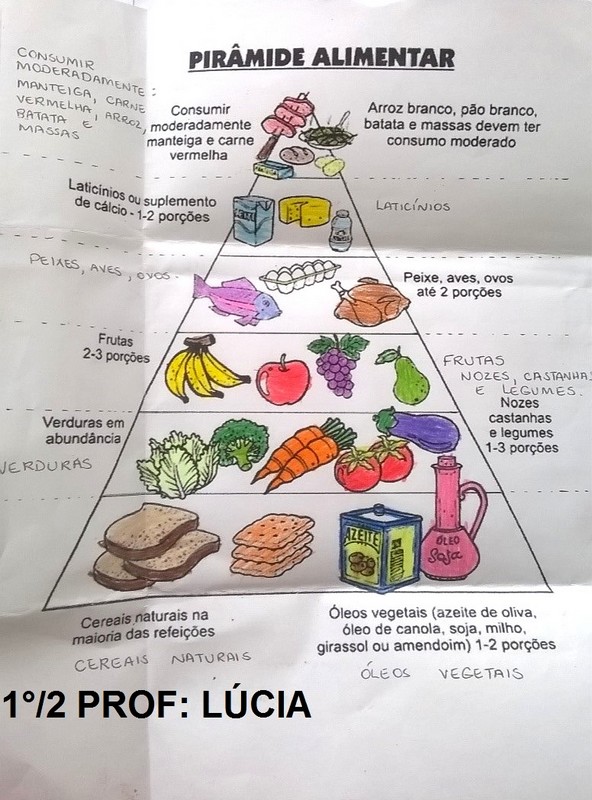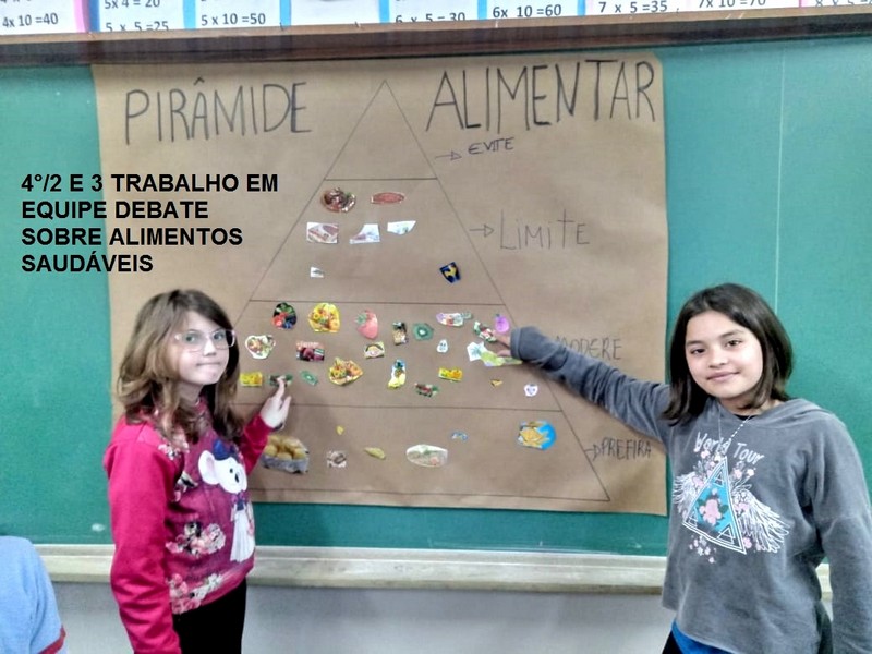 Outras fizeram o registro de cantiga: cabeça, ombro, joelho e pé e o cartaz do corpo humano, além do registro de hábitos saudáveis e a compreensão da pirâmide alimentar a partir do semáforo da alimentação. Também houve o registro diário e coletivo de cardápio semanal da merenda escolar. E ainda a lista de alimentos saudáveis incluindo atividade com a família, utilizando recorte e colagem.